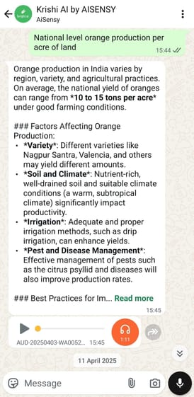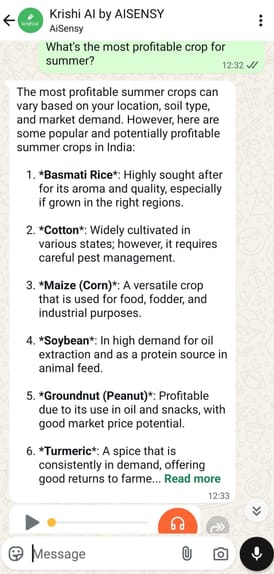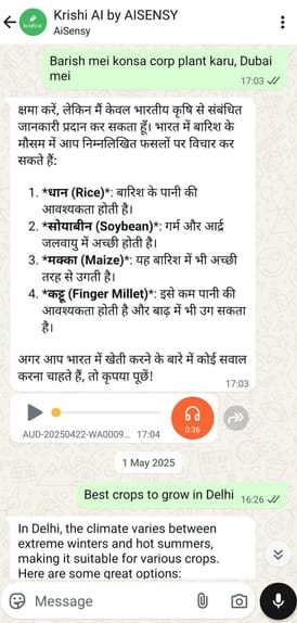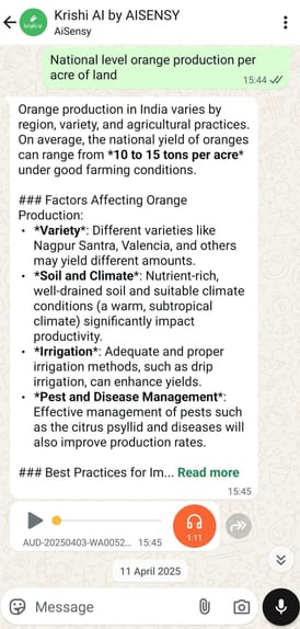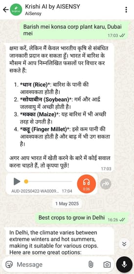 Whether through text or audio, the AI Agent offers rich, accessible agricultural advice.